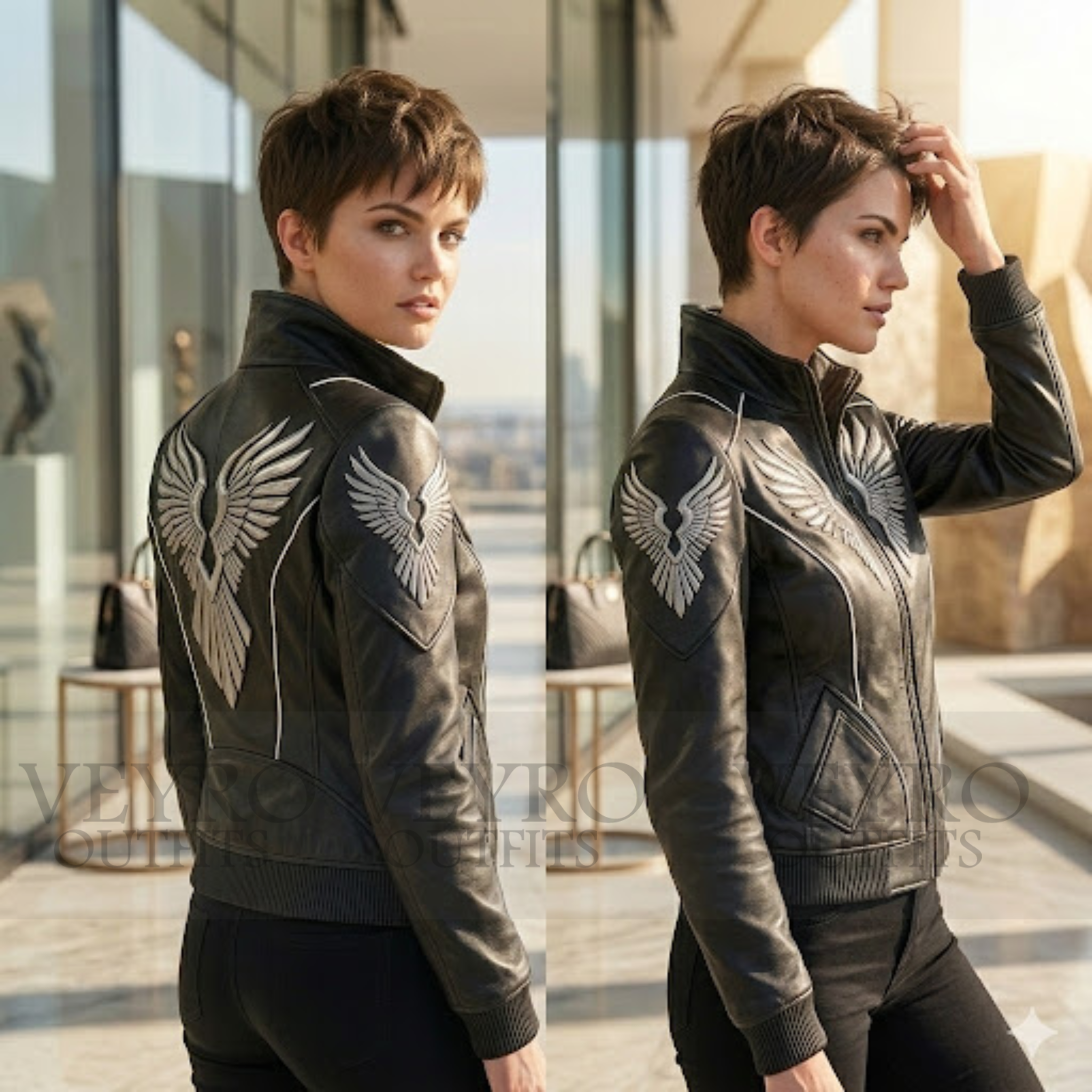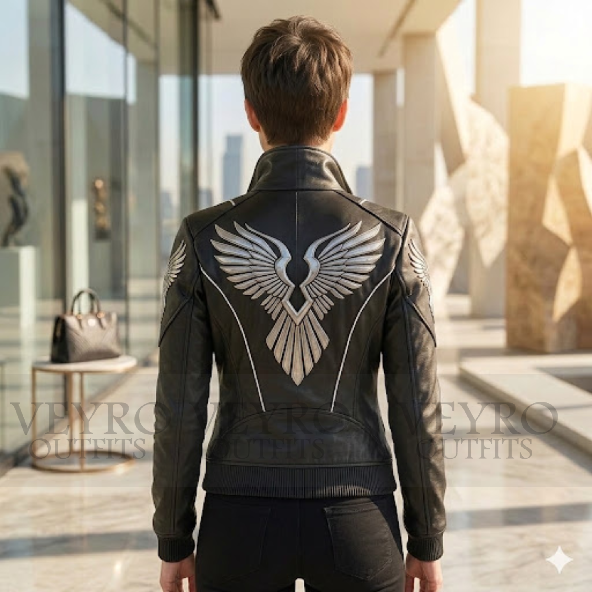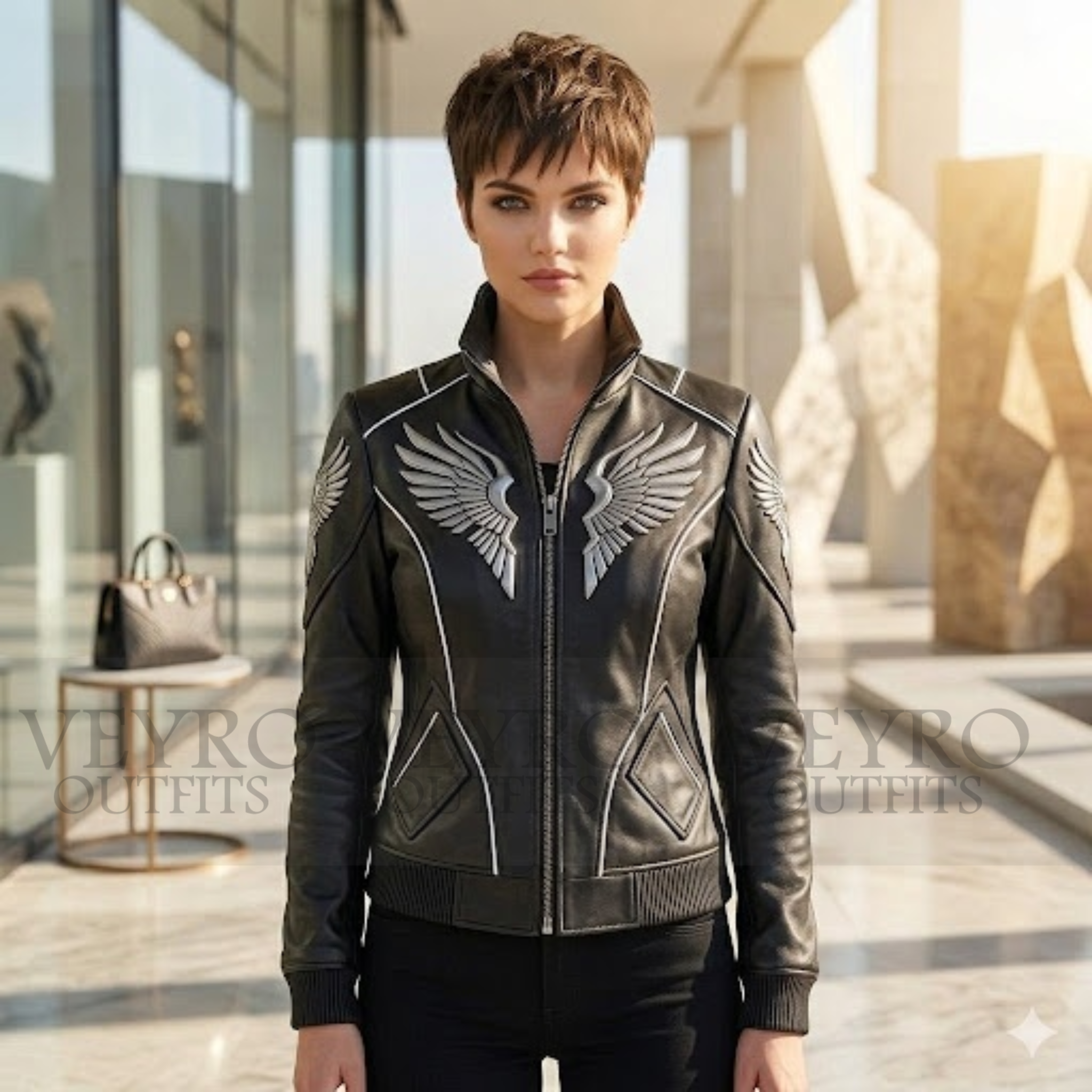 This Silver Wing Bomber Jacket is designed to celebrate your shape. It features a slim-fit cut that follows your natural contours without being restrictive. Cropped perfectly at the waist, it hits just at the hip line to elongate your legs and create a balanced proportion. The structured shoulders, enhanced by the wing patches, create a powerful yet feminine silhouette that exudes confidence.