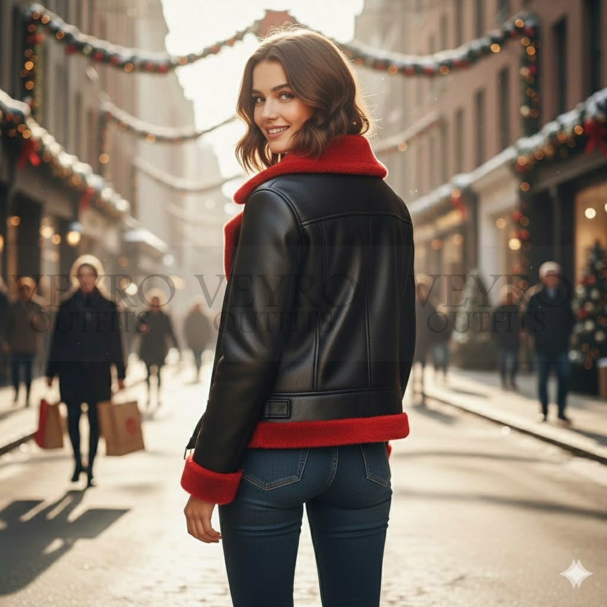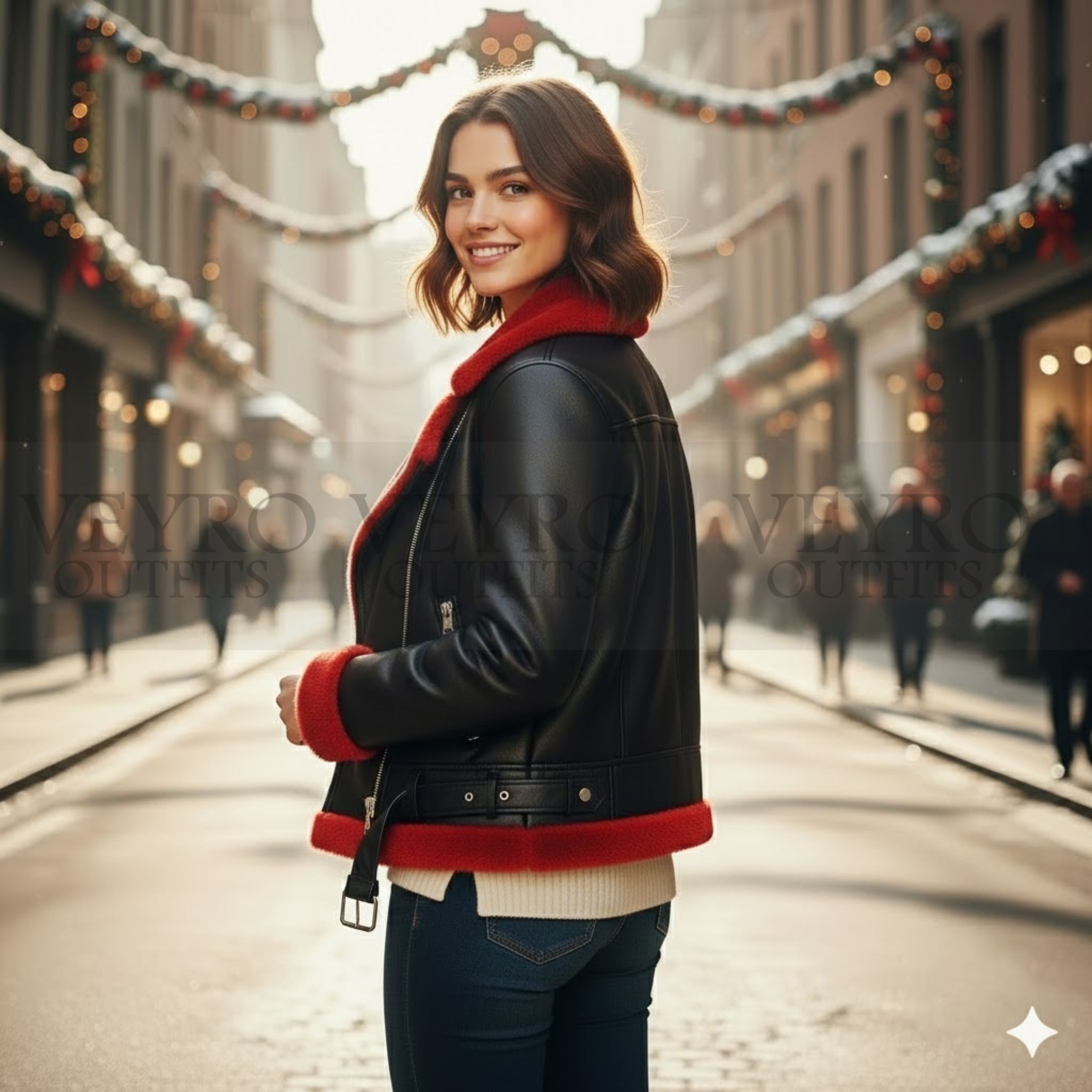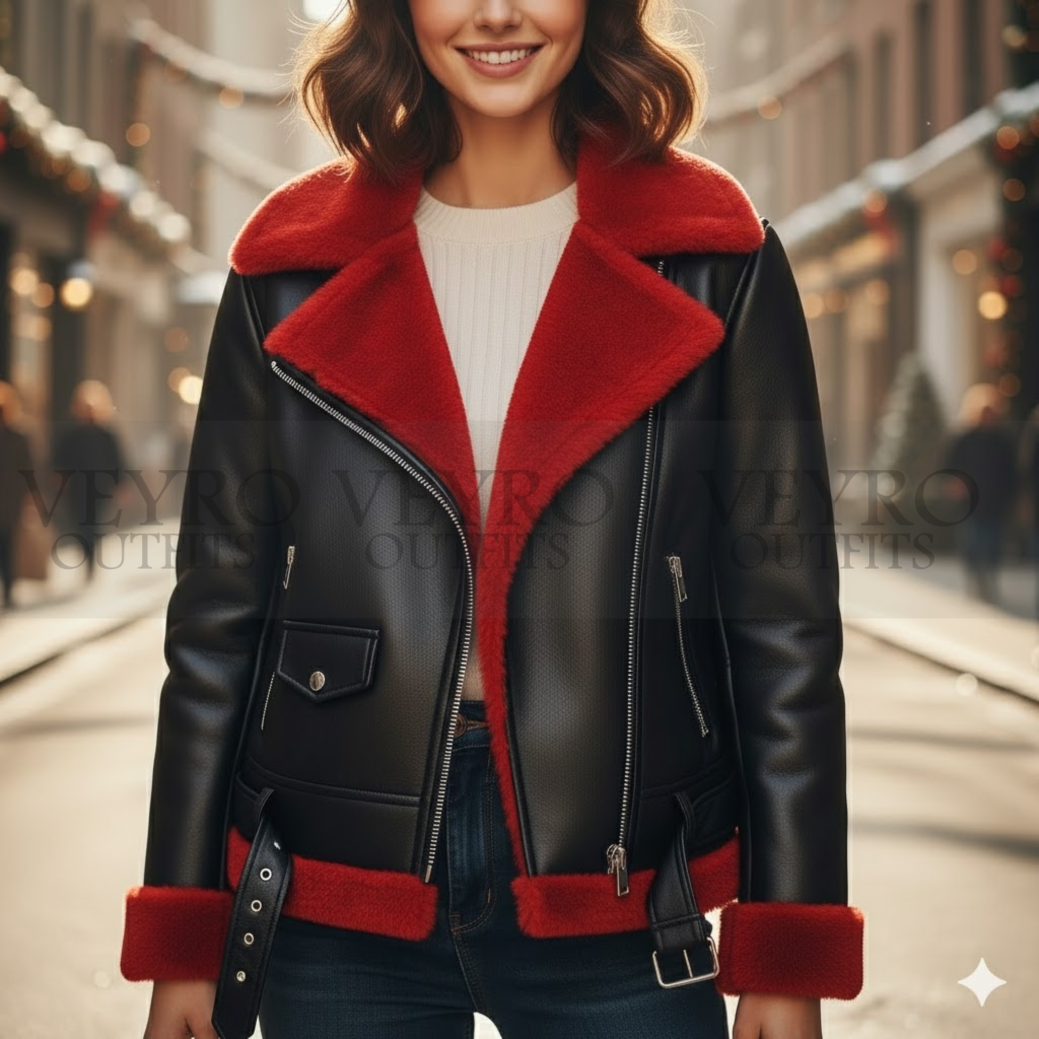 Introducing the Saint Nick Vintage Moto Jacket, exclusively from Veyro Outfits. This is not just another winter layer. This is a statement piece. A Christmas jacket designed for women who want festive spirit without sacrificing style.