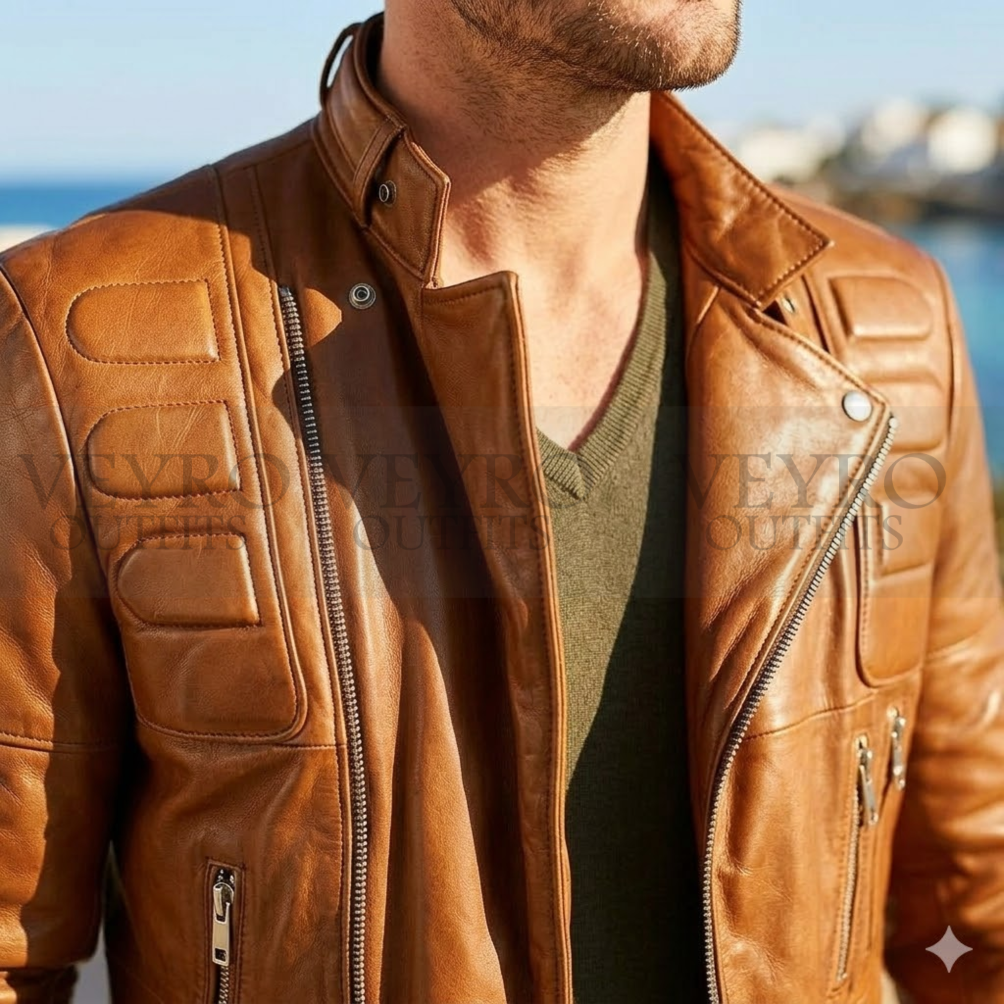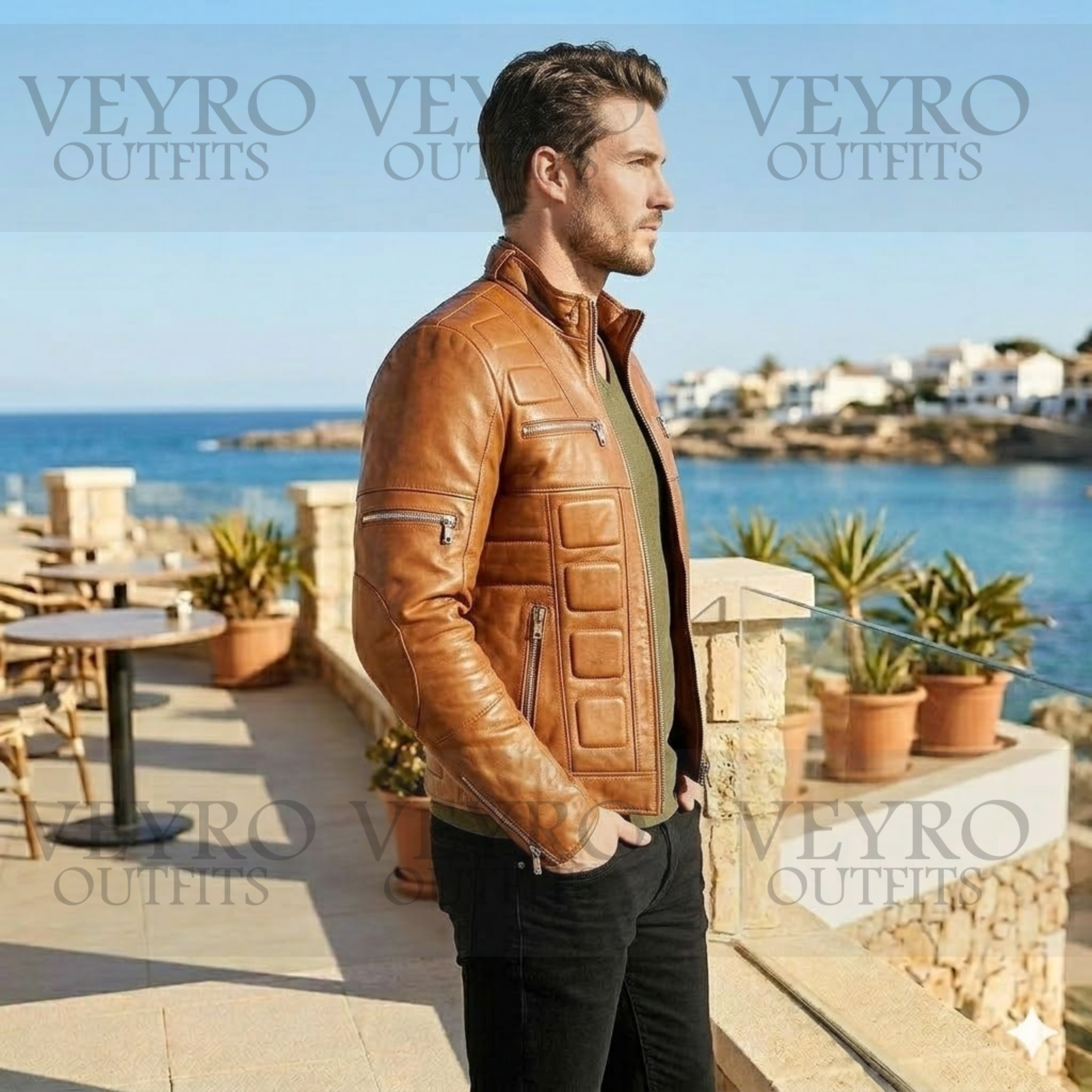 Welcome to Veyro Outfits, your premier destination for premium outerwear in Canada. We are excited to introduce our latest exclusive piece: the Men’s Brown Leather Jacket with a unique ‘Block’ design. This is not just another biker jacket; it is a statement piece.