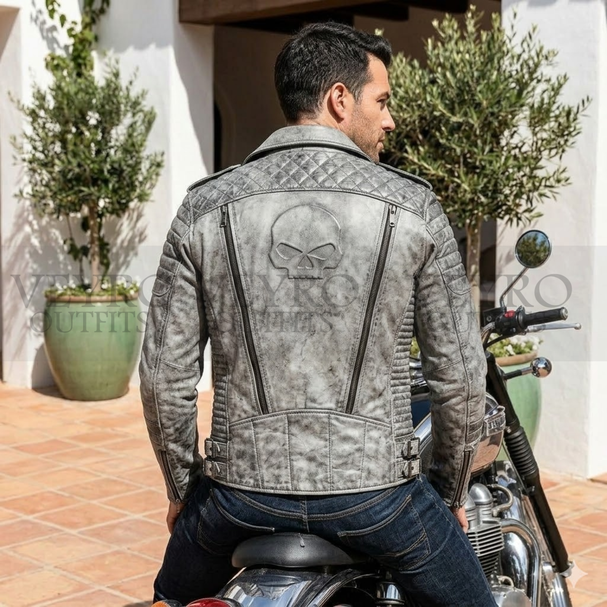 Route 66 Skull Rider | Men’s Distressed Grey Leather Motorcycle Jacket