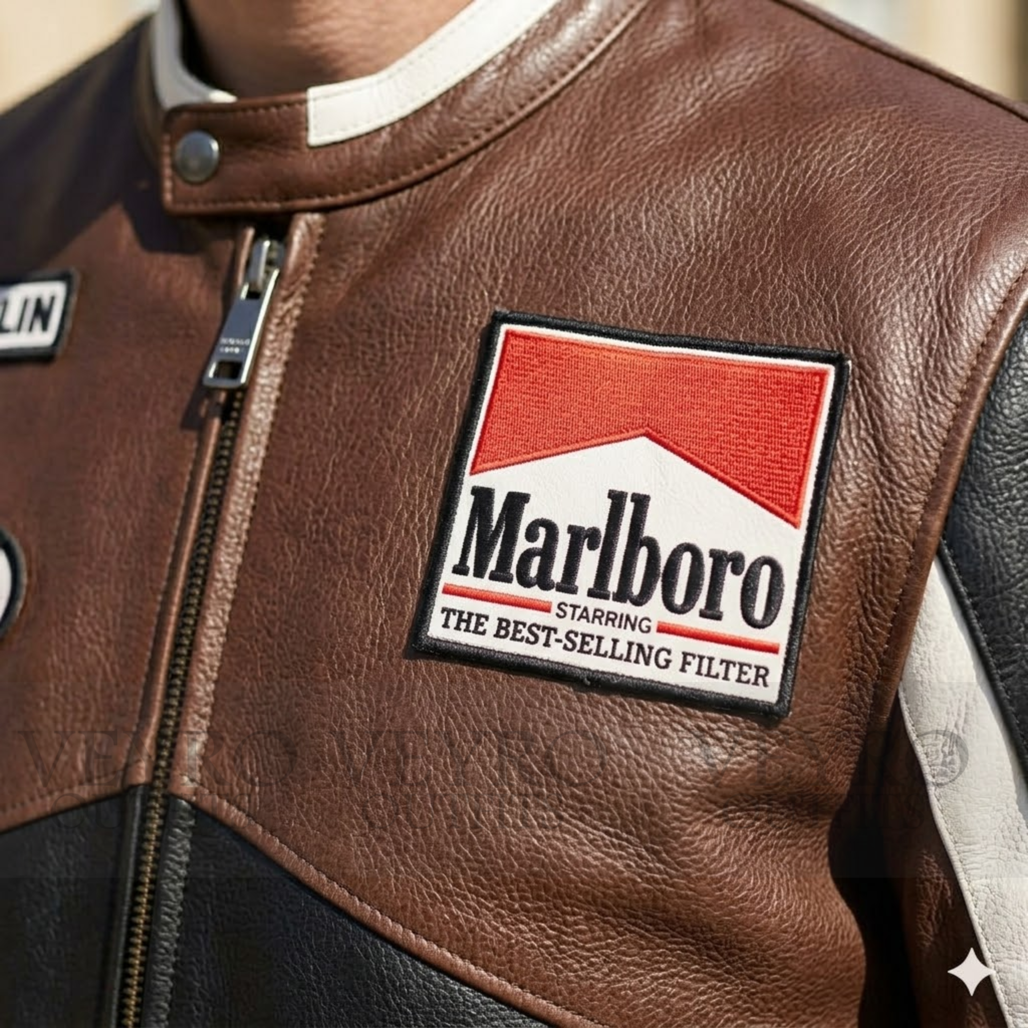 Turn the jacket around. The top section has a bold “RACING” patch in white block letters. The lower back has a second large “Marlboro” logo. A unique V-shaped leather paneling separates the brown and black sections on the back. This leather jacket commands attention from every direction.