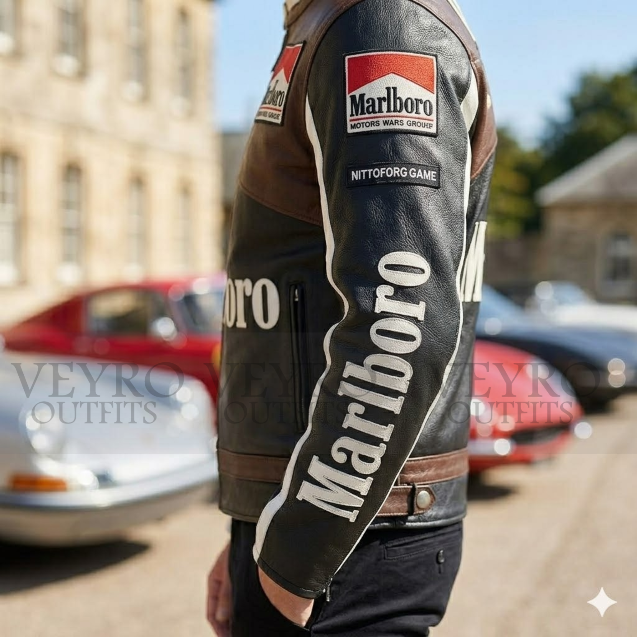 Both arms of this jacket feature contrasting white vertical stripes. These stripes run from shoulder to cuff. Large “Marlboro” text is printed and stitched vertically on the lower sleeves. Small sponsorship patches like “Nittoforg Game” sit on the upper shoulders. Every angle of this racing leather jacket tells a racing story.