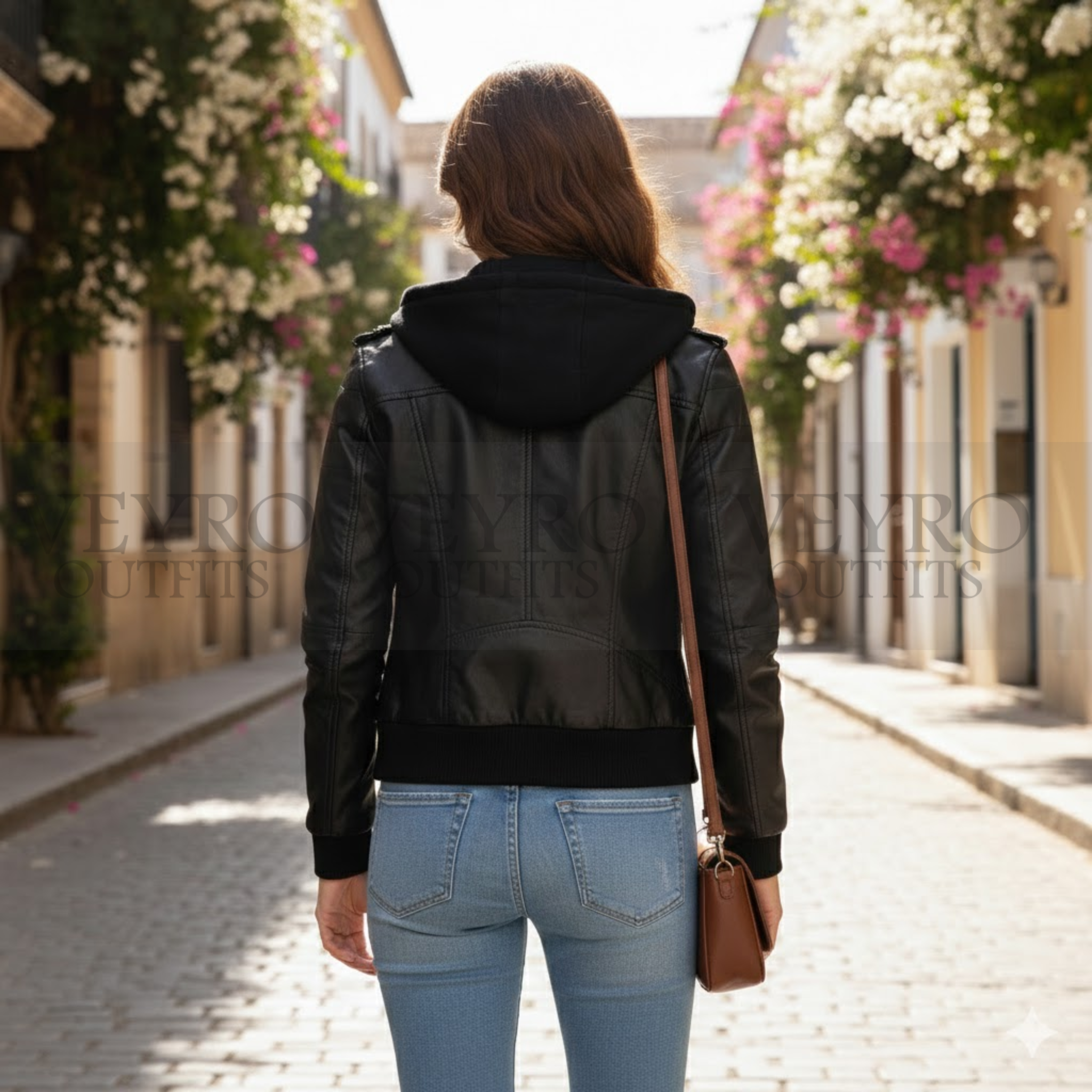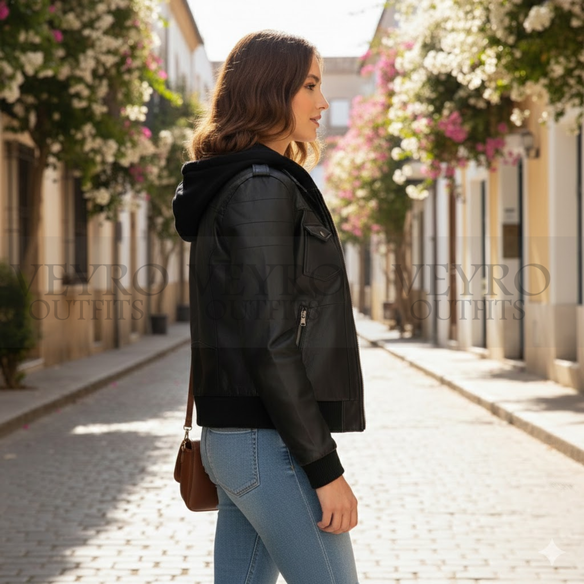 Are you searching for a Women’s Leather Bomber Jacket that combines edgy style with everyday comfort? Look no further than the Shadow Luxe Hooded Leather Bomber Jacket, available exclusively at Veyro Outfits. This stunning piece is designed for the modern Canadian woman who values both fashion and function.