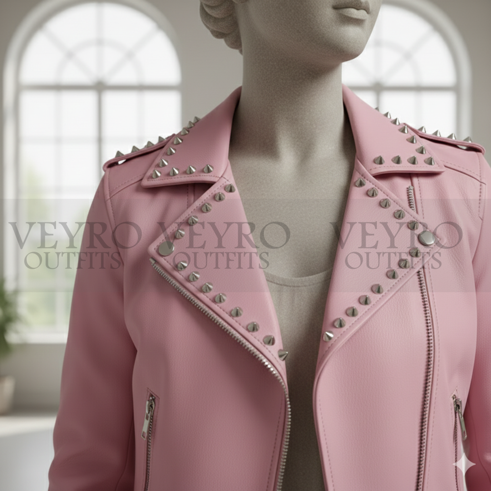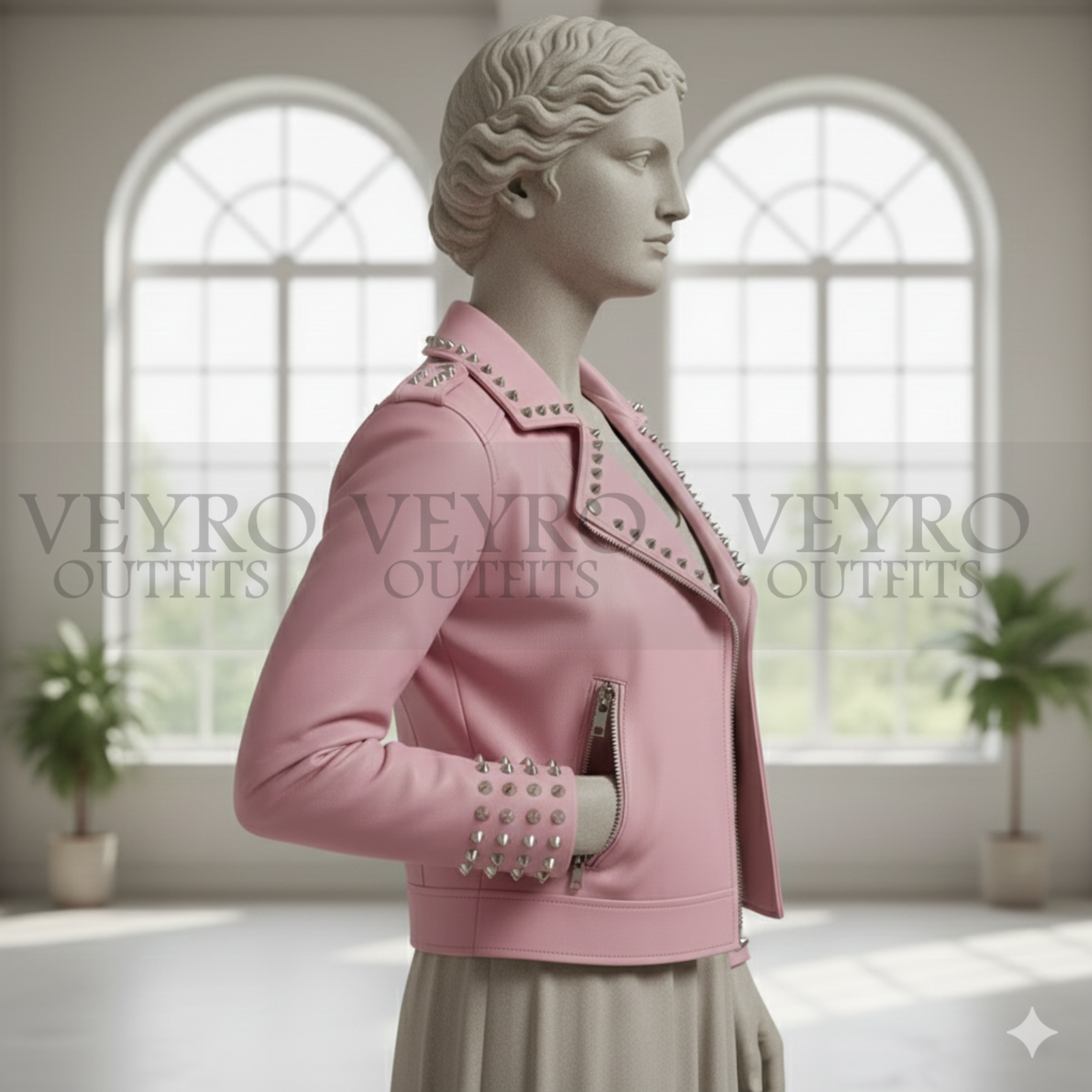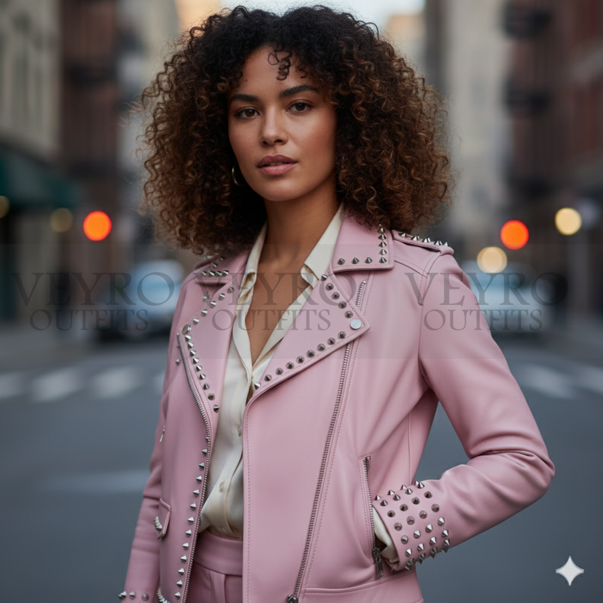 This Studded leather jacket is for the woman who doesn’t follow trends—she sets them. The pastel pink shade is unexpectedly versatile. It pairs perfectly with everything from crisp white jeans and a tee to a flowing black dress. The silver hardware adds just the right amount of rebellion.