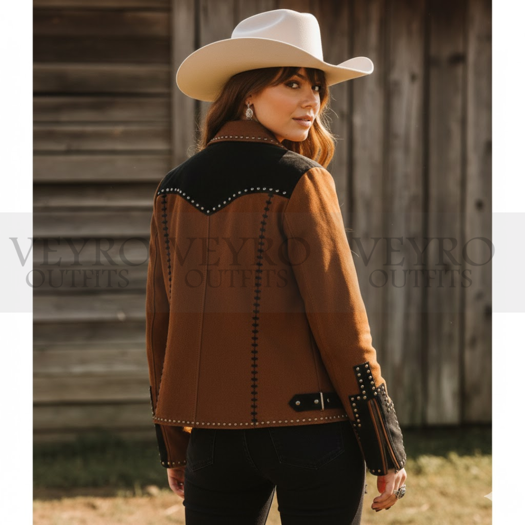 Signature Western Yoke: A sharp, V-shaped black yoke spans the back and shoulders, a classic cowboy-inspired design that adds structure and visual interest.