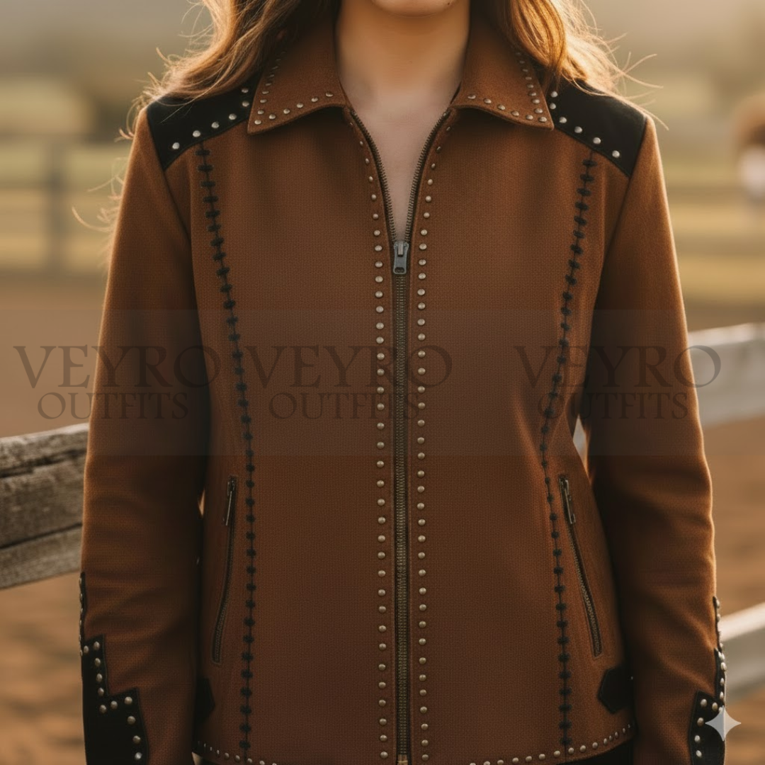 Studded Accents: Tiny silver metal studs meticulously line the edges of the zipper, collar, hem, and cuffs. This detail provides a subtle sparkle and a touch of rock-and-roll toughness.