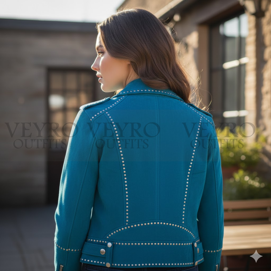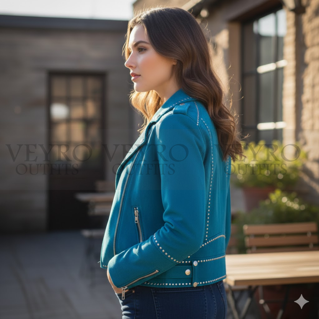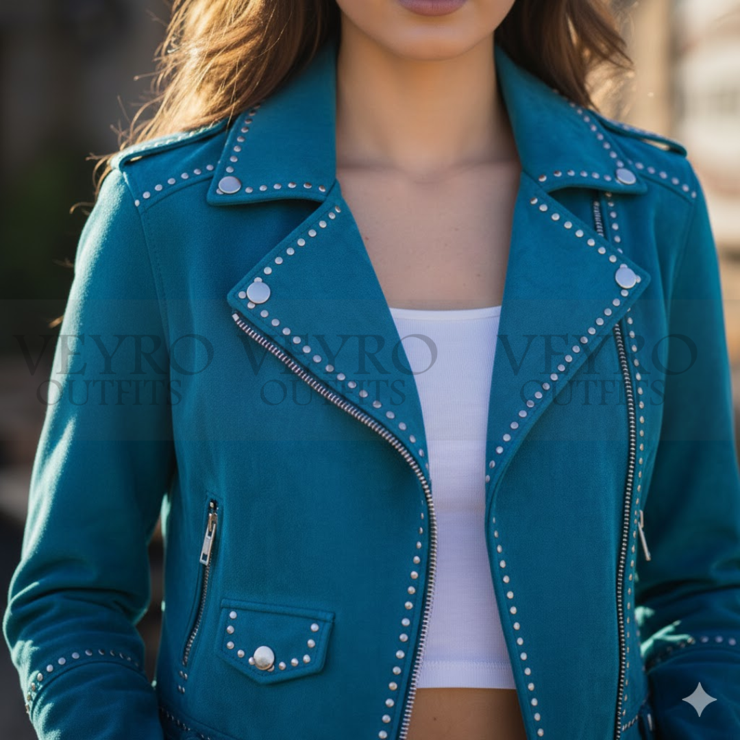 Embrace a piece that reflects your bold spirit. With its unparalleled combination of luxurious teal suede, expert cropped fit, and hand-applied stud detailing, The Peacock Rider is waiting to become the centerpiece of your closet. Experience the Veyro difference.