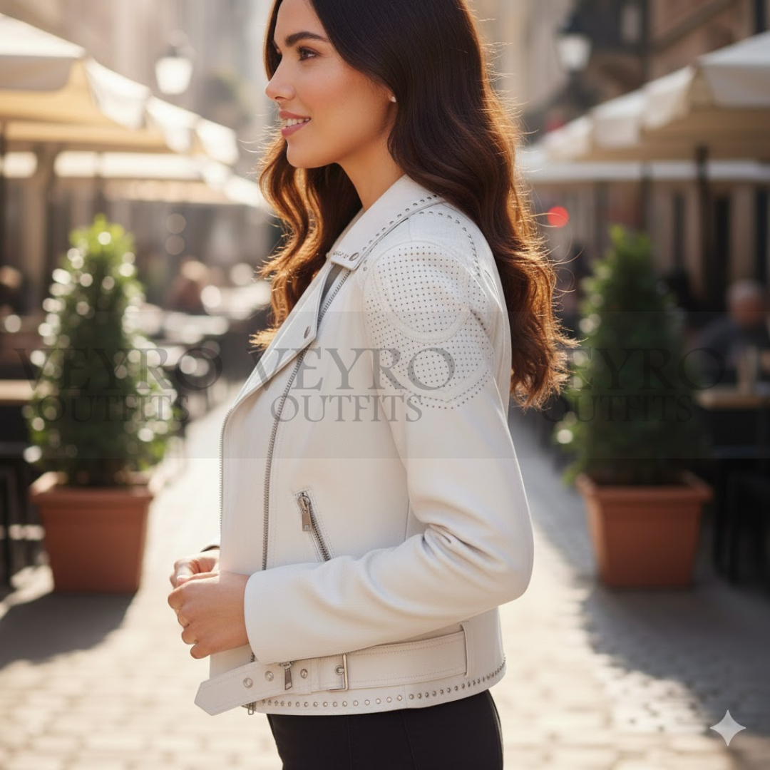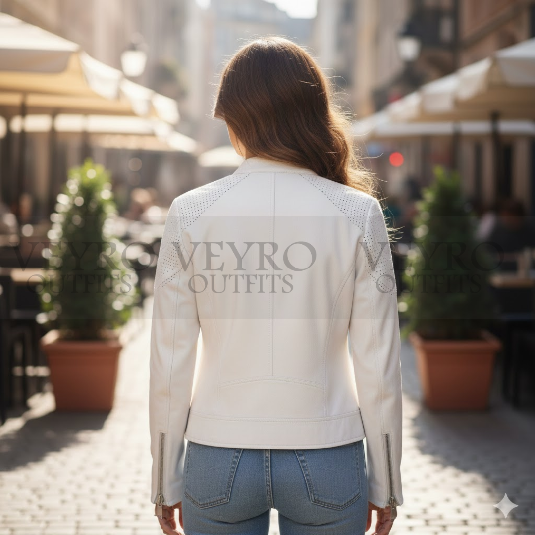 Customize your fit with the long vertical zippers on the cuffs. Adjust them for a tight or relaxed look. From behind, the design shines. Vertical seams create a sleek, slimming line. The standout feature is the subtle peplum hem. A curved “V” stitch at the back gently skims over the hips. It adds a feminine flourish that balances the jacket’s edgy front.