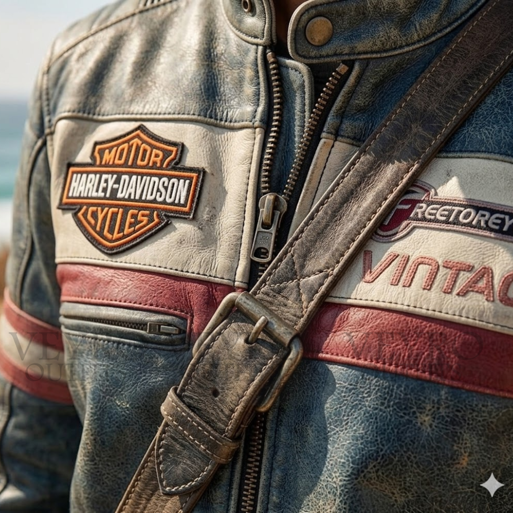 Left chest: Cream leather panel with red “Vintage” text. Classy. Loud. Perfect.