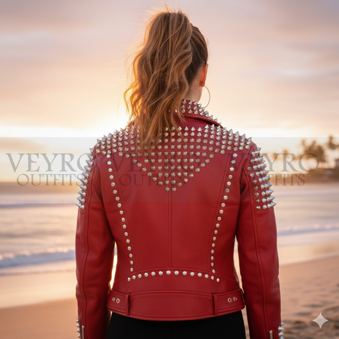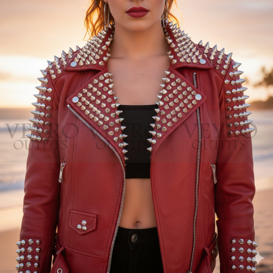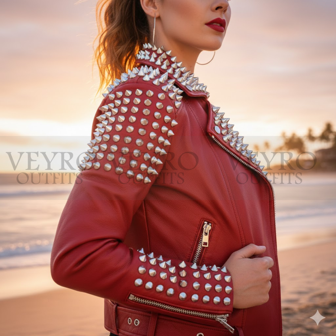 This is not just outerwear—it’s your armor. Our women’s studded jacket redefines bold fashion with its fiery red presence and meticulously placed silver hardware. Designed for the fearless woman across Canada, this piece combines punk-rock attitude with contemporary tailoring to create a truly unforgettable statement piece.