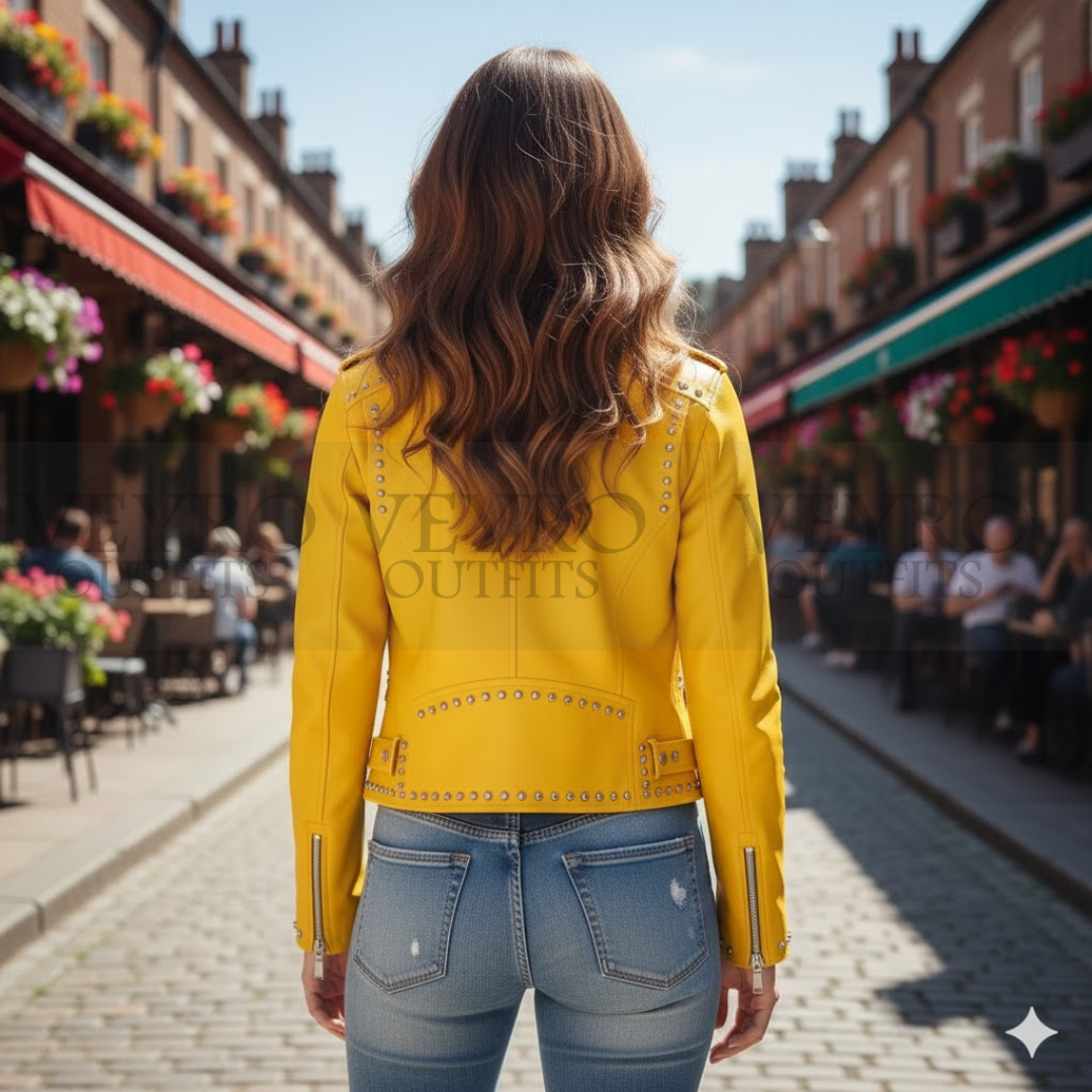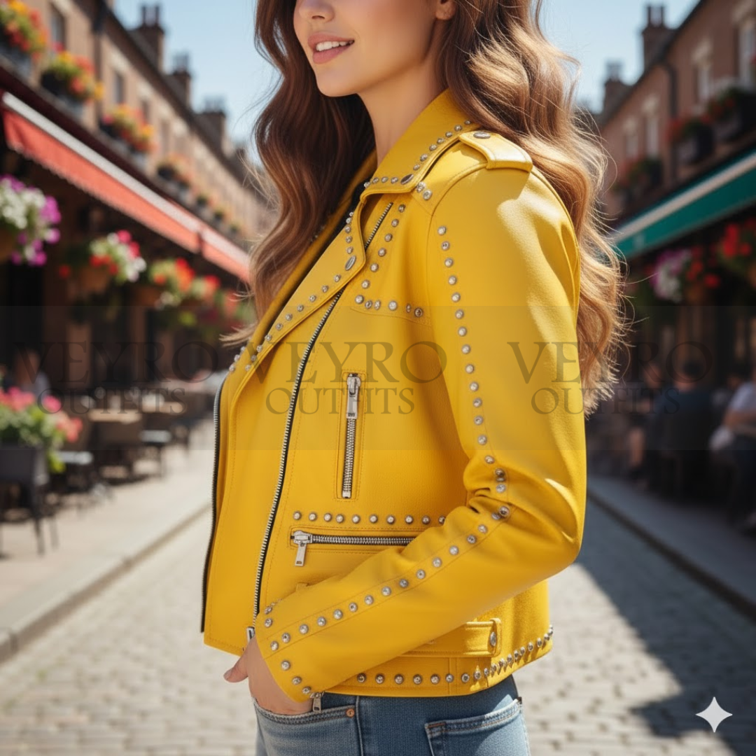 Welcome the spotlight. The Sundown Studded Jacket is not just another piece of outerwear; it’s a declaration of confidence. Designed for the woman who owns her space, this vibrant yellow studded jacket from Veyro Outfits masterfully blends classic moto rebellion with head-turning, modern flair. It’s crafted to turn every sidewalk into your runway, from downtown Toronto to the coastal views of Vancouver.