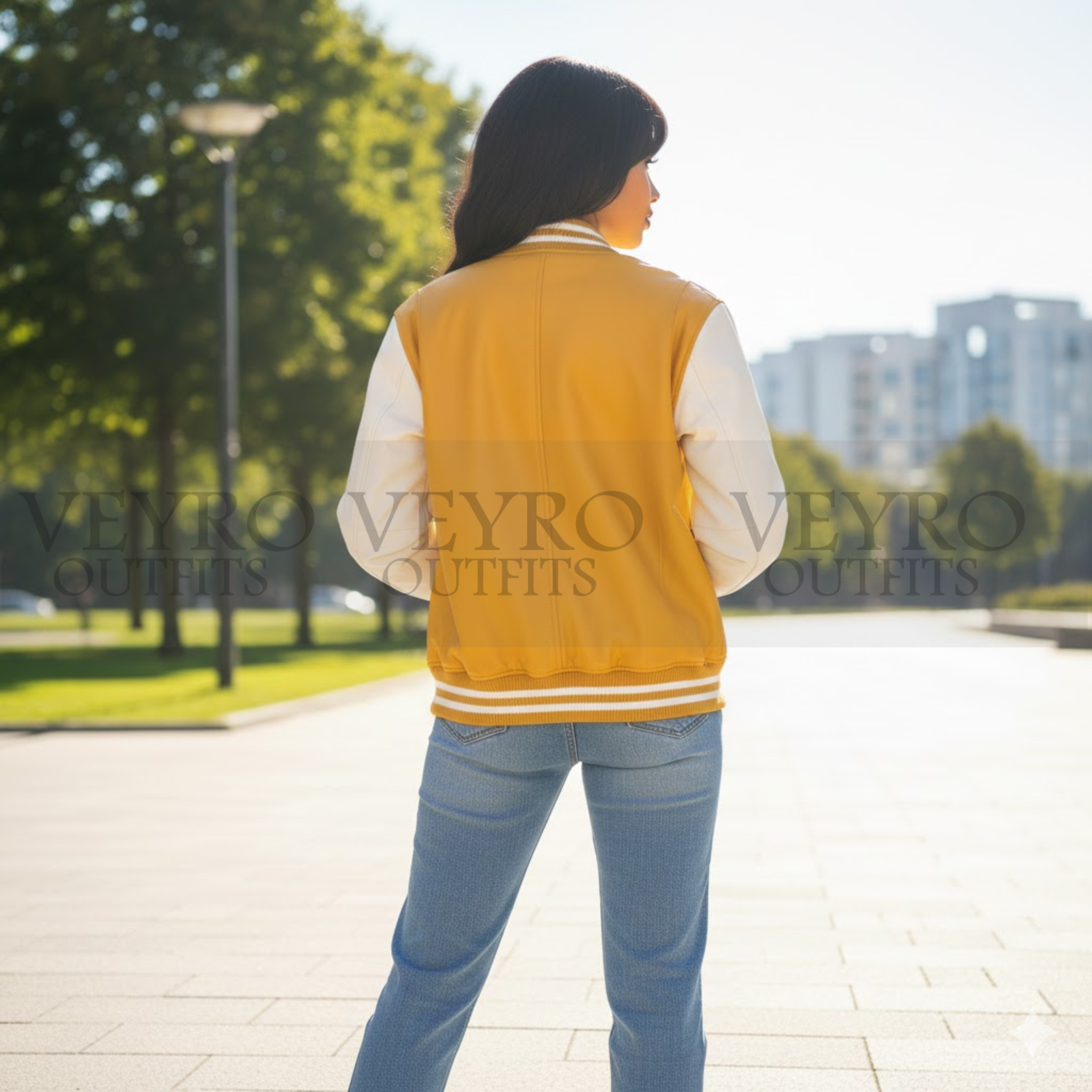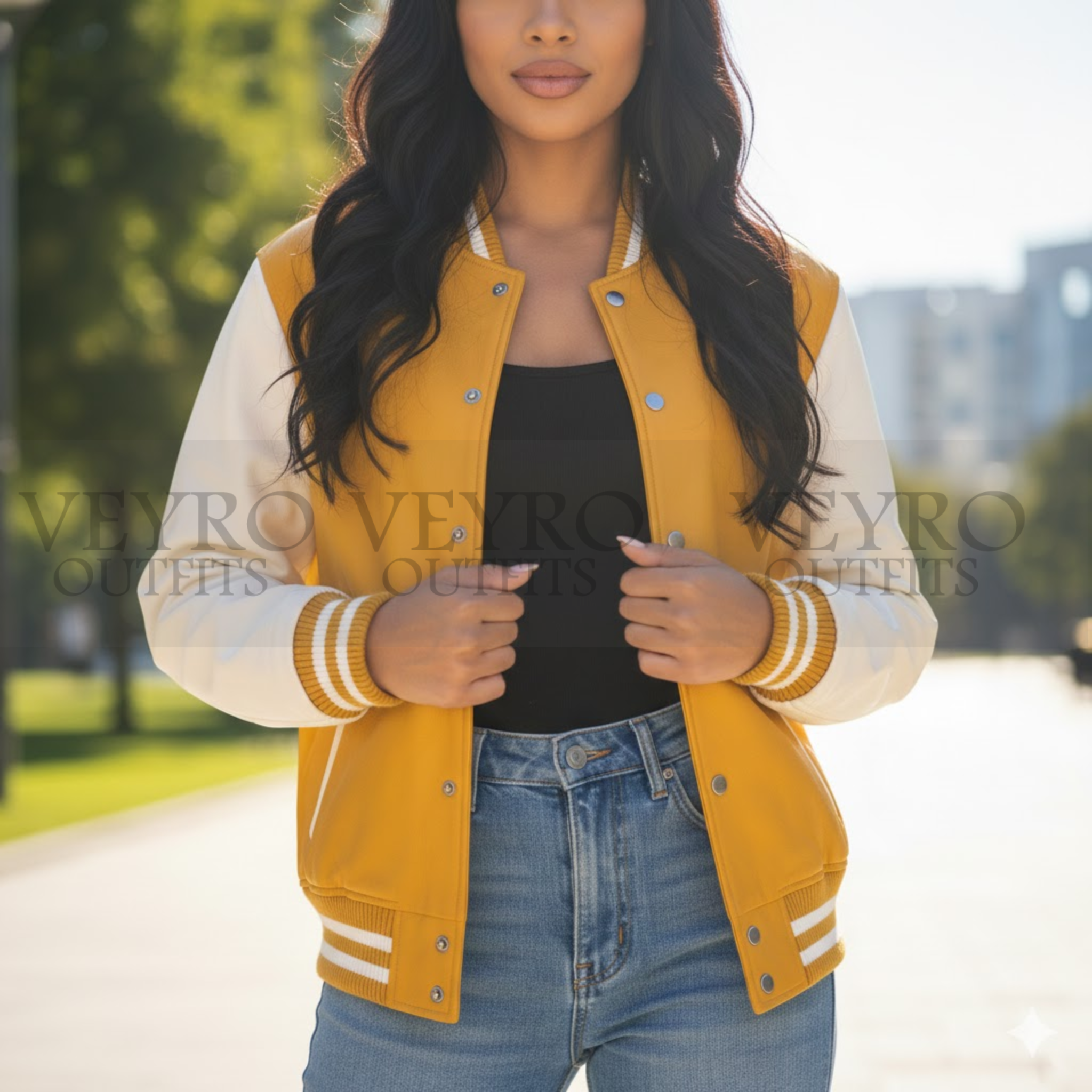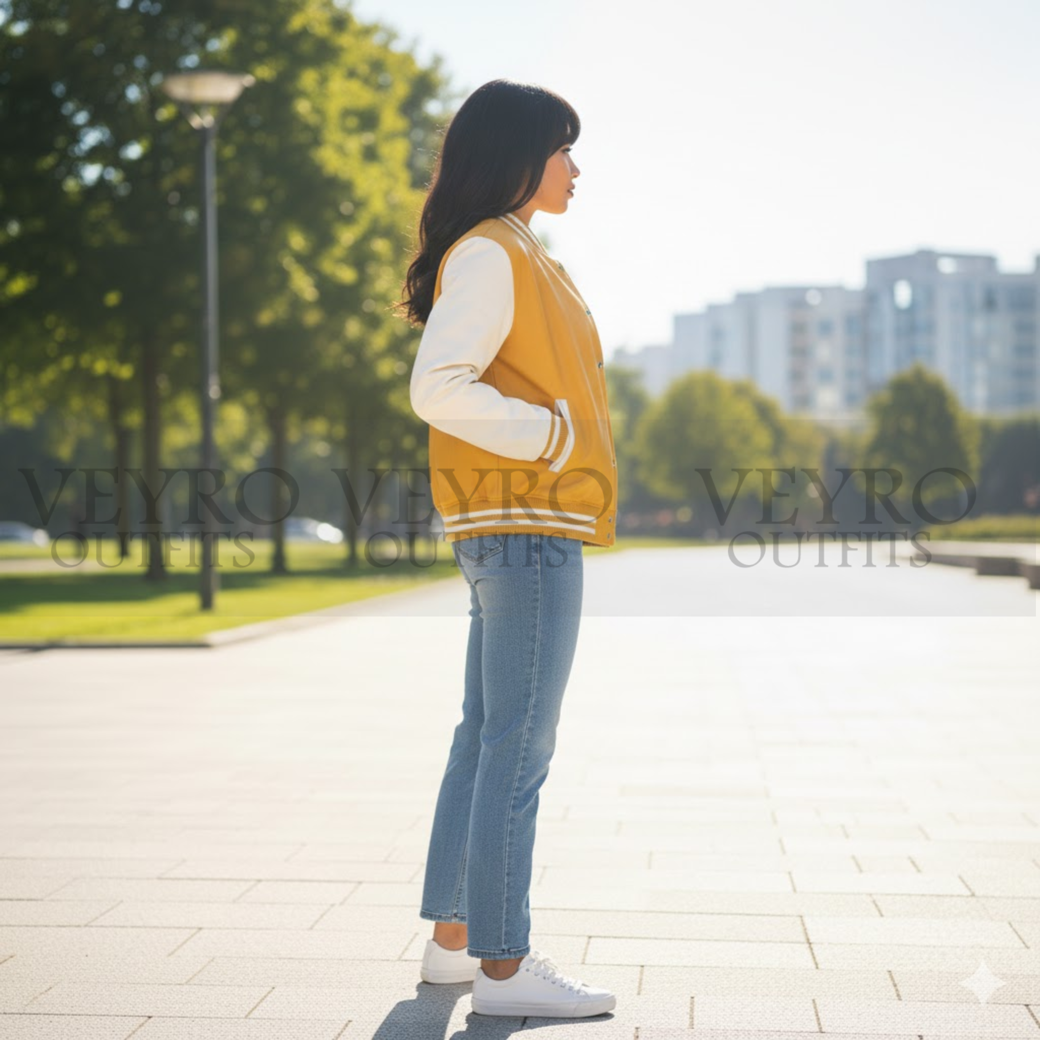 Looking for a varsity jacket that perfectly blends timeless athletic style with modern fashion sensibility? You’ve found it. This isn’t just another bomber jacket—it’s the ultimate wardrobe essential designed for the contemporary Canadian woman. At Veyro Outfits, we’ve reimagined the classic letterman silhouette, creating a piece that honors tradition while making a bold, modern statement. With its eye-catching mustard yellow body and sophisticated cream sleeves, this jacket is crafted to become the most reached-for item in your closet.
